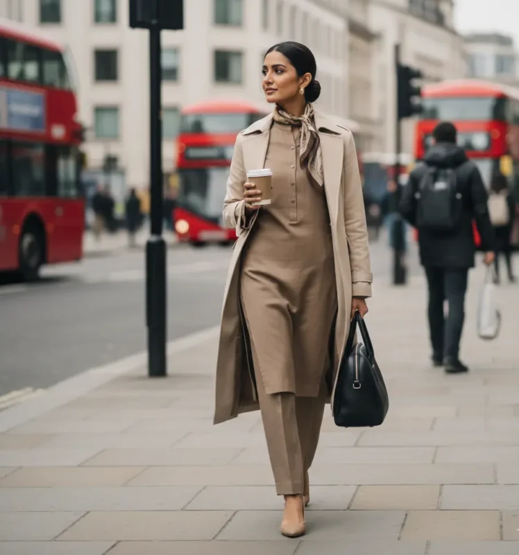 These suits typically include long shirts, straight trousers, and matching shawls, ideal for layering in colder temperatures. British Pakistani professionals often combine traditional outfits with Western staples like trench coats, boots, and neutral scarves to meet workplace expectations.